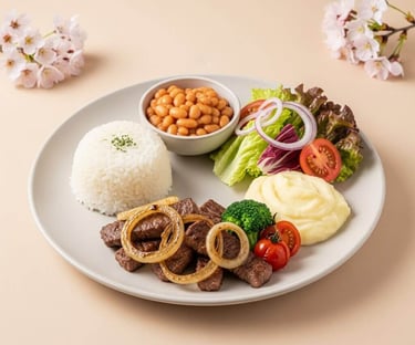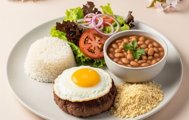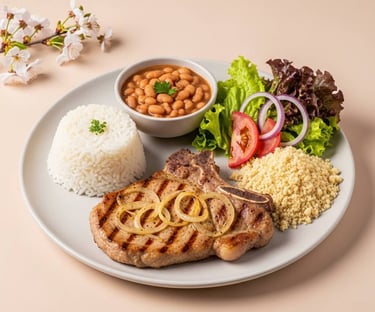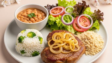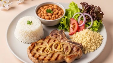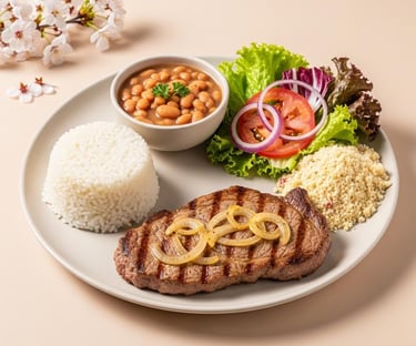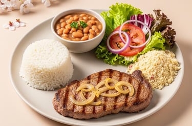 Bisteca grelhada acebolada, arroz, feijão, farofa e salada.