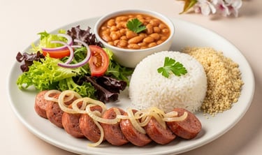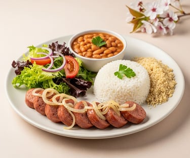 Calabresa defumada com cebola, arroz, feijão , farofa e salada.