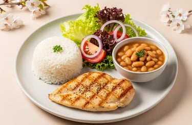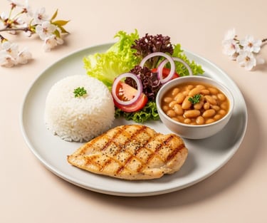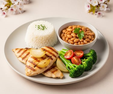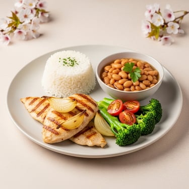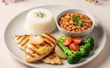 Frango grelhado, arroz, feijão e brocólis salteado.