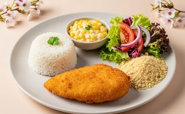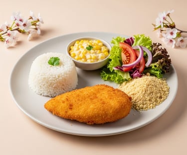 Frango empanado e frito, arroz, creme de milho, farofa e salada.