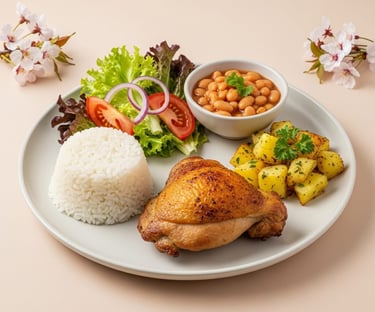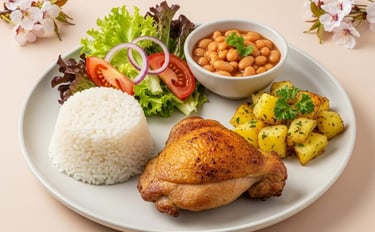 Sobrecoxa de frango assada, arroz, feijão, batata souté e salada.