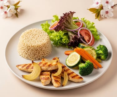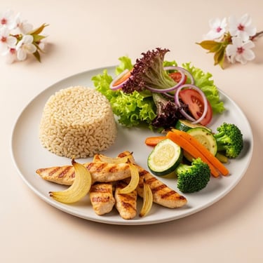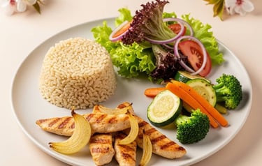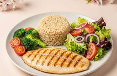Filé de Tilápia grelhada, arroz integral, legumes salteados e salada.