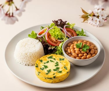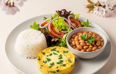 Omelete com muçarela e salsinha, arroz, feijão e salada.