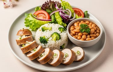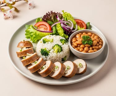 Linguiça de frango grelhada, arroz com brocólis , feijão e salada.