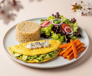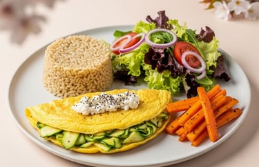 Omelete com abobrinha ralada, ricota fresca, arroz integral , cenoura refogada e salada.