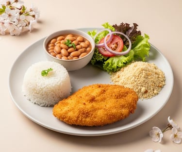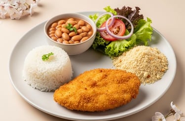 Frango empanado e frito, arroz, feijão, farofa e salada.