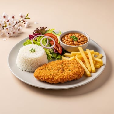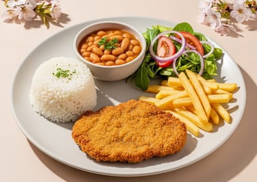 Frango empanado e frito, arroz, feijão, fritas e salada.