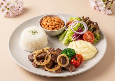 Bife grelhado com cebola, arroz, feijão, farofa e salada.