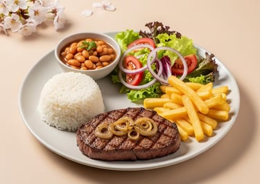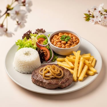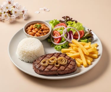 Bife grelhado com cebola, arroz, feijão, fritas e salada.