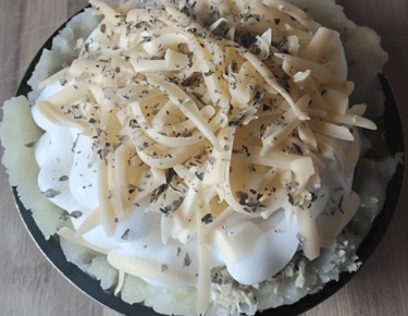 Purê de batata, mix de legumes salteados, requeijão e muçarela.