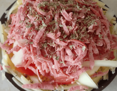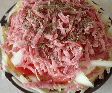 Batata cozida, calabresa ralada, azeitona, cebola, muçarela , requeijão e orégano.