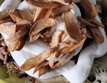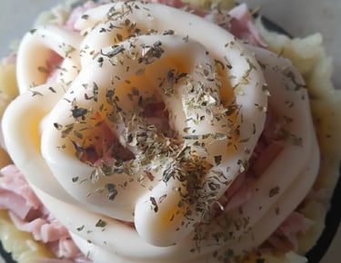 Batata cozida, presunto ralado, azeitona ,muçarela, requeijão e prégano.