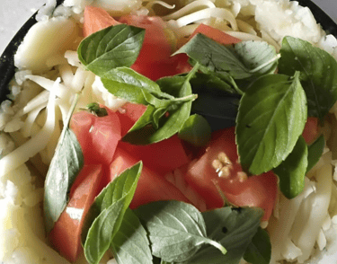 Batata cozida, queijo muçarela, tomate e manjericão.