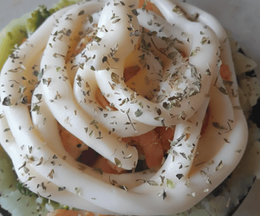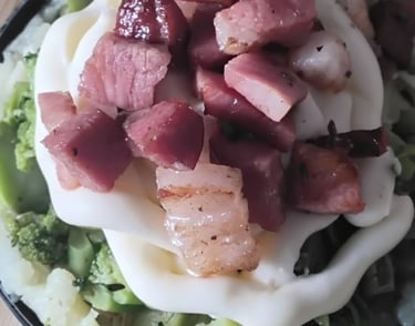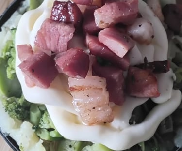 Purê de batata, brocólis refogado, cubinhos de bacon, requeijão e muçarela.