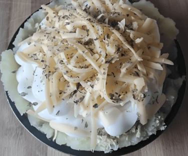 Purê de batata, carne moída refogada, requeijão e muçarela.