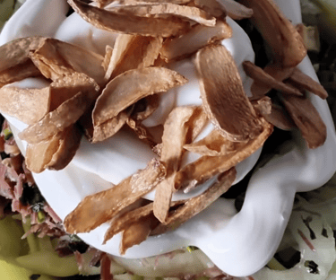 Batata cozida, carne seca desfiada e temperada , cebola, muçarela, requeijão e crispy de alho.