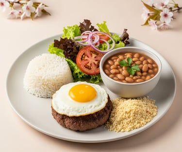 Hambúrguer indústrializado grelhado, arroz, feijão, farofa e salada.