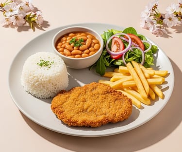 Bife empanado e frito , arroz, feijão, fritas e salada.
